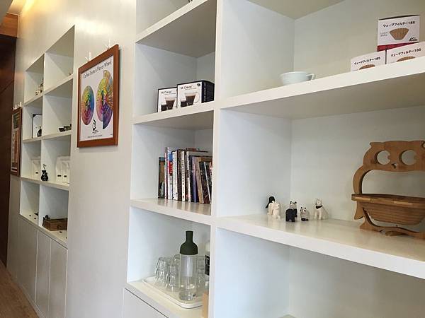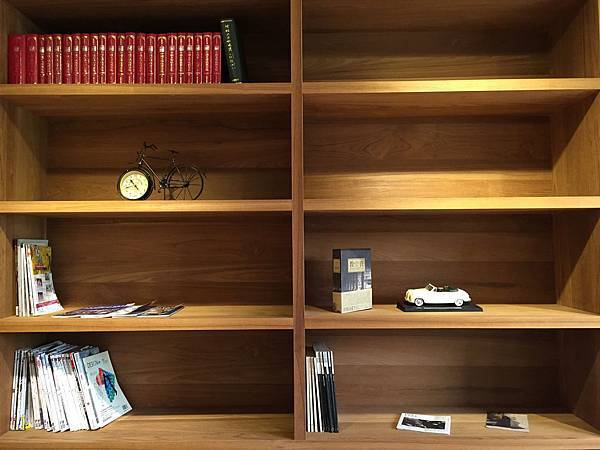 牆是一整面的大書櫃,有很多書和一些可愛的擺飾